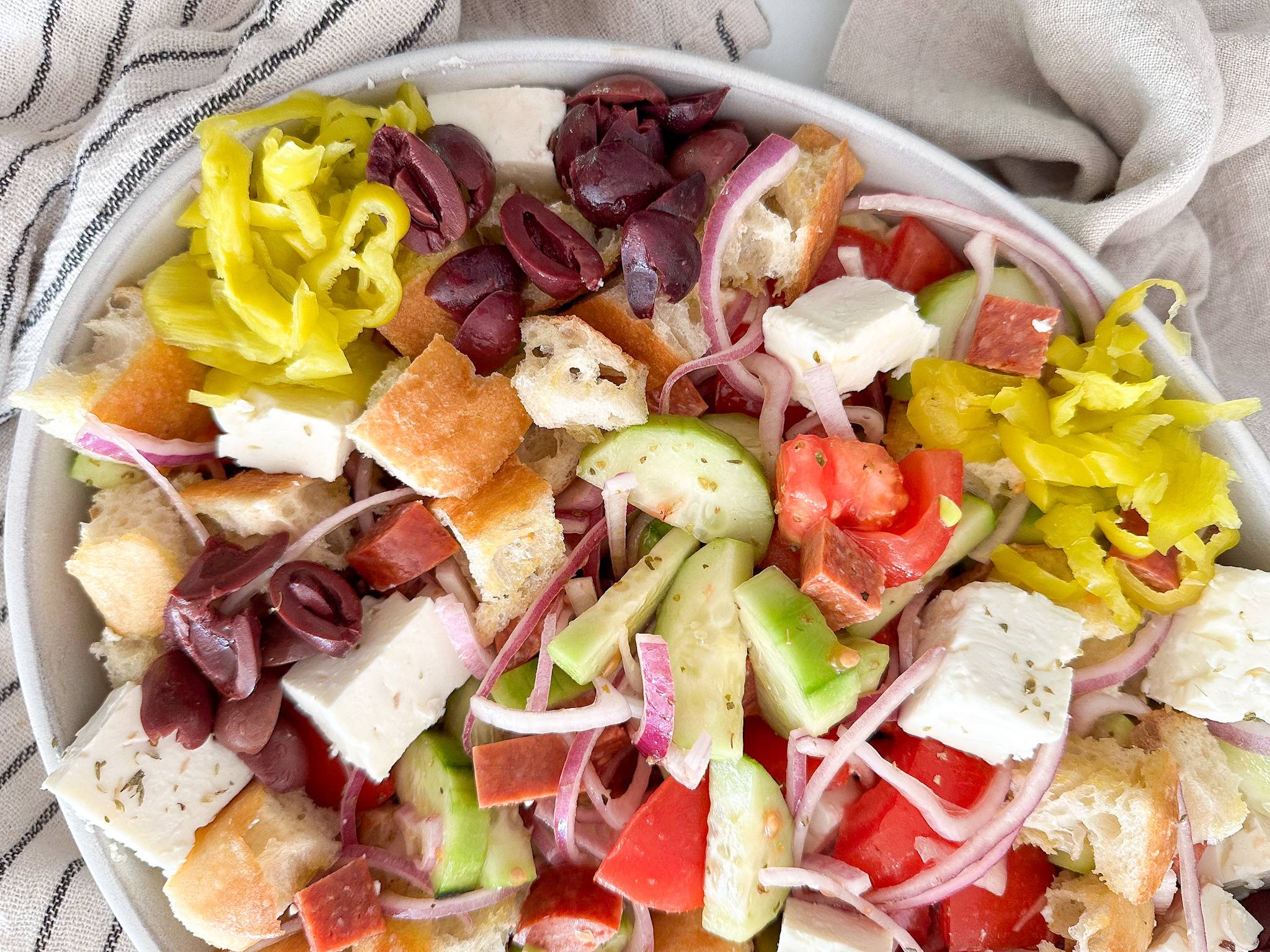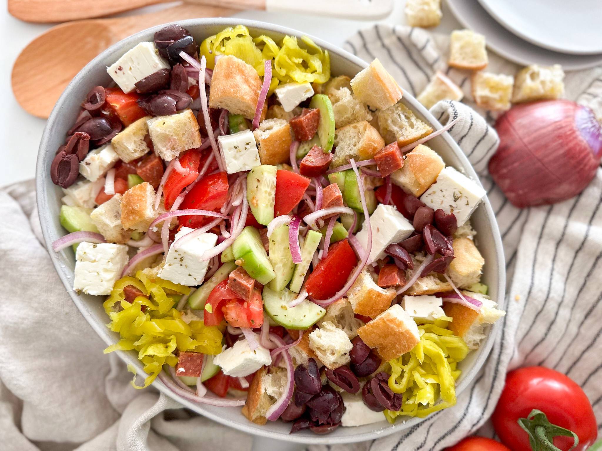 Greek panzanella salad is the perfect weeknight dinner. It's the salad of all salads, A little bit traditional panzanella, a little bit Mediterranean and a little bit antipasto. Make it under 15 minutes and it’s easy to prep ahead.